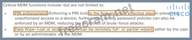 Which two functions of MDM increase security for lost devices that access data from the network? (Choose two.)