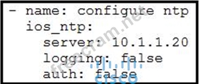 NTP server 10.1.1.20 must be configured on the target Cisco IOS XE device without using authentication and logging. Which state should be added on a new line at the end of the Ansible task?