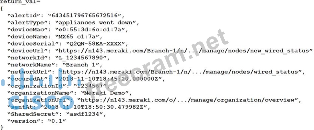 Refer to the exhibit. The task is to create a Python script to display an alert message when a Meraki MX Security Appliance goes down. The exhibit shows sample data that is received. Which Python snippet displays the device name and the time at which the switch went down?