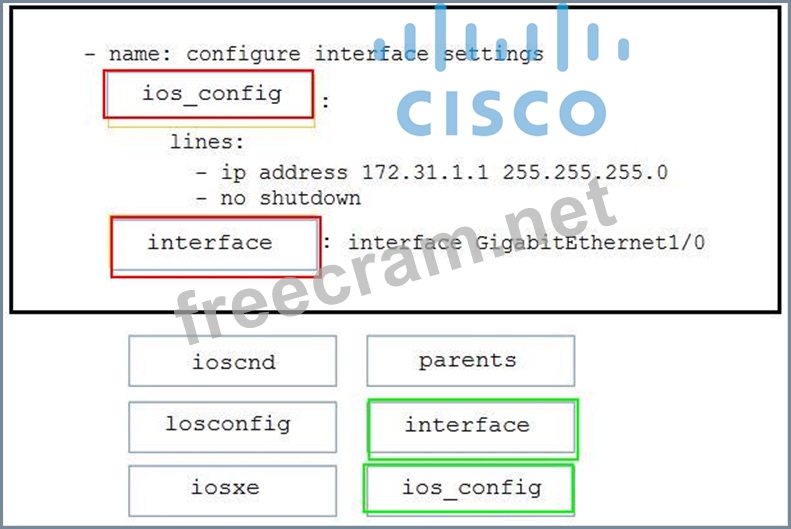 Drag and drop the code from the bottom onto the box where the code is missing in the Ansible playbook to apply the configuration to an interface on a Cisco IOS XE device. Not all options are used.