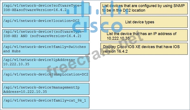 Refer to the exhibit. A GET request is issued to the Cisco DNA Center REST API. Drag and drop the GET request URL subpaths from the left onto the objectives on the right. Not all options are used.