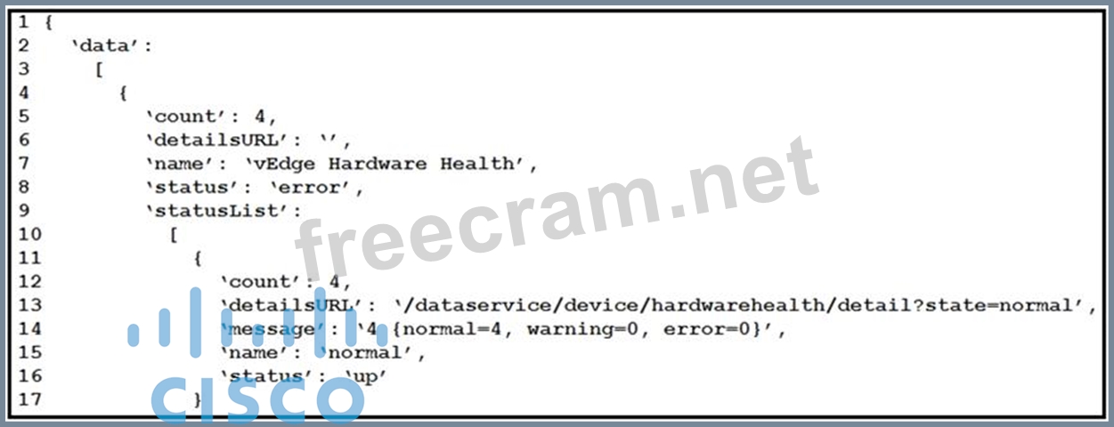 Cisco SD-WAN deployment must be troubleshooted using vManage APIs. A call to vEdge Hardware Health API returns the data in the exhibit (only a portion is shown). If this JSON is converted to a Python dictionary and assigned to the variable "d", how the status is accessed that is indicated on line 16?