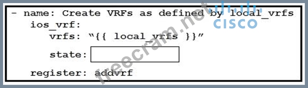 An engineer creates an Ansible playbook to configure VRF information using a local_vrfs variable. The code must be completed so that it can be tested. Which string completes the code?