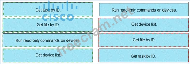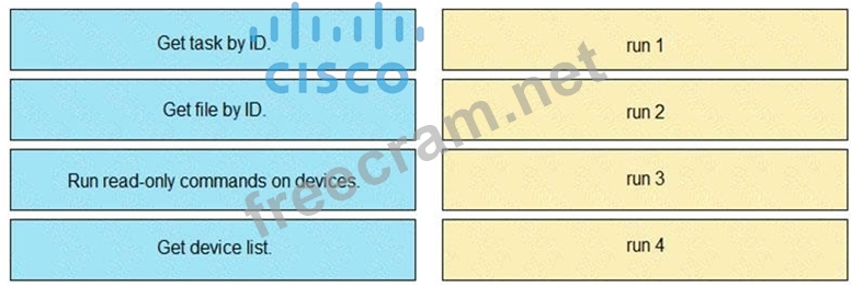 A Cisco DNA Center script must be written to retrieve a list of interfaces on a switch. Drag and drop the API calls that are needed to return the list of interfaces using the Command Running APIs from the left into the correct sequence on the right.
