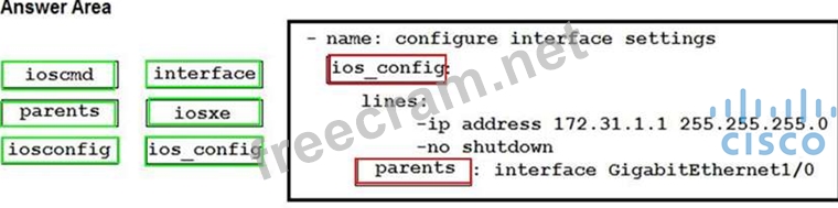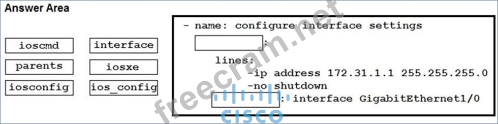 Drag and drop the commands to the Ansible playbook that applies configuration to an interface on a Cisco IOS XE device. Not all options are used.