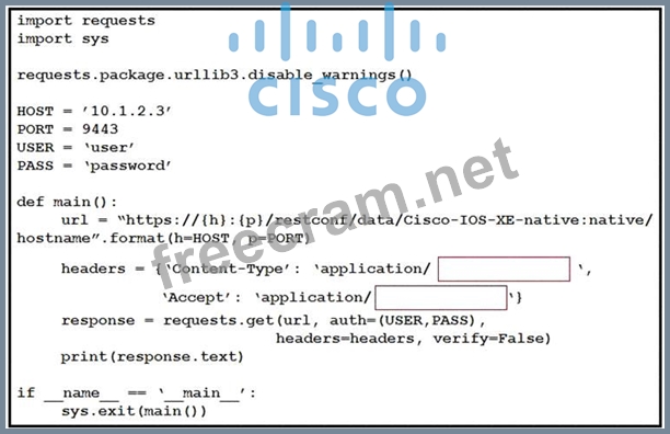 An engineer creates a Python script using RESTCONF to display hostname information. The code must be completed so that it can be tested. Which string completes the highlighted areas in the exhibit?