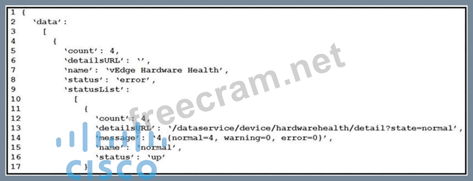 Cisco SD-WAN deployment must be troubleshooted using vManage APIs. A call to vEdge Hardware Health API returns the data in the exhibit (only a portion is shown). If this JSON is converted to a Python dictionary and assigned to the variable "d", how the status is accessed that is indicated on line 16?