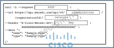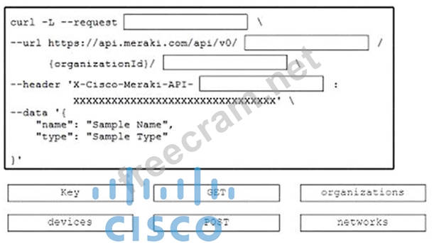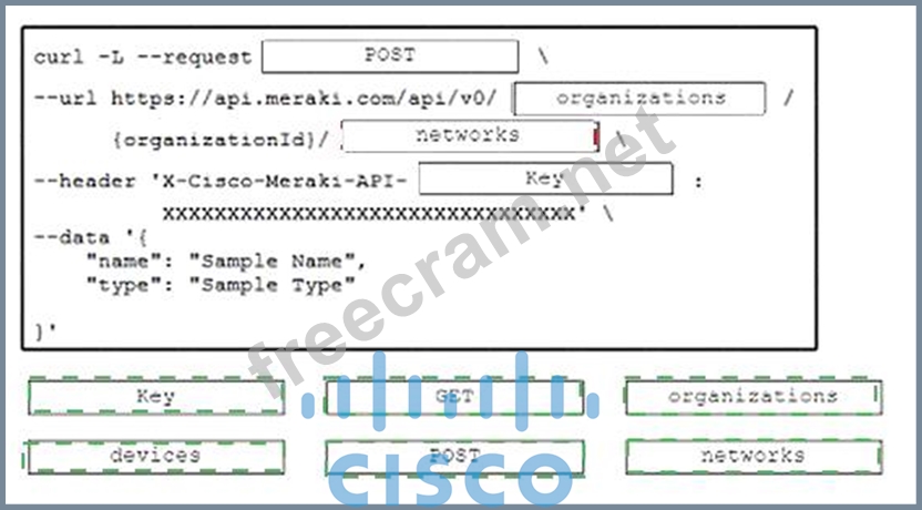 Drag and drop the code snippets from the bottom onto the blanks in the code to create a network for a new Cisco Meraki organization. Not all option are used?