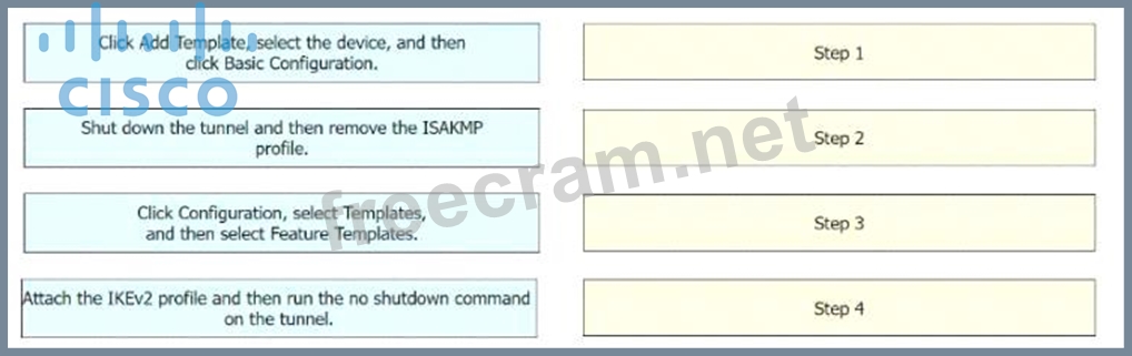 Step 1 = Click Configuration, select Templates, and then select Feature Templates. Step 2 = Click Add Template, select the device, and then click Basic Configuration. Step 3 = Shut down the tunnel and then remove the ISAKMP profile. Step 4 = Attach the IKEv2 profile and then run the no shutdown command on the tunnel.