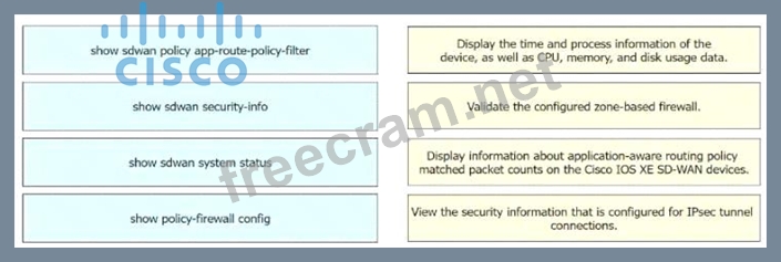 Display the time and process information of the device, as well as CPU, memory, and disk usage data. = show sdwan system status1 Validate the configured zone-based firewall. = show policy-firewall config1 Display information about application-aware routing policy matched packet counts on the Cisco IOS XE SD-WAN devices. = show sdwan policy app-route-policy-filter1 View the security information that is configured for IPsec tunnel connections. = show sdwan security-info The commands used to identify issues on a Cisco IOS XE SD-WAN device are as follows1: