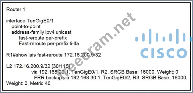Router 1 is connected to router 2 on interface TenGigE0/1. Which interface provides the alternate path to 172.16.200.9/32 when the link between router 1 and router 2 goes down?