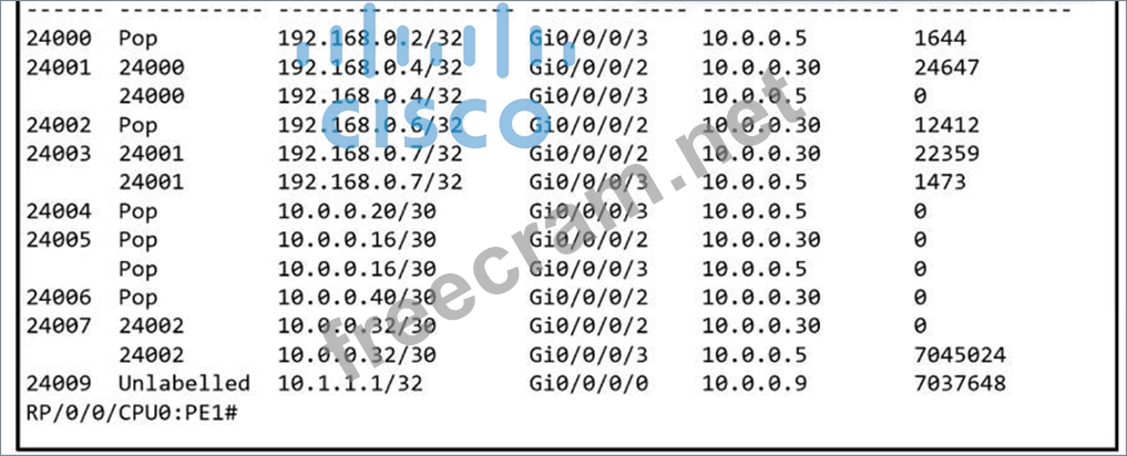 Refer to the exhibits. A network operator is troubleshooting packet loss seen from the R1 loopback interface to the R2 loopback interface over the core network. The operator is attempting to identify the next leg in the path from PE1. Which interface and label path should the operator investigate next?