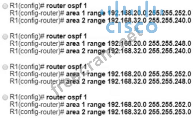 Refer to the exhibit. An engineer applied the summarization configuration on R1 for four networks (192.168.20.0/24 to 192.168.23.0/24) in area 1 and eight networks (192.168.32.0/24 to 192.168.39.0/24) in area 2 to stop the flooding of all the customer routes. While checking the routing table of R2, the engineer noticed that R1 is still sending only specific routes to R2. Which configuration should the engineer apply on R1 to summarize routes?
