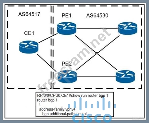 Refer to the exhibit. A network operators configuring BGP PIC on CE1 on already established neighborships with PE1ana PE2 inside the fully converged MPLS network.
