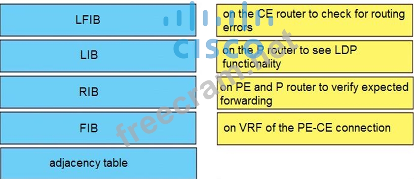 An engineer is troubleshooting end-to-end customer traffic across an MPLS VPN service provider network. Which tasks should the engineer use to solve the routing issues? Drag and drop the table types from the left onto the most useful troubleshooting tasks/router types on the right. (Not all options are used.)