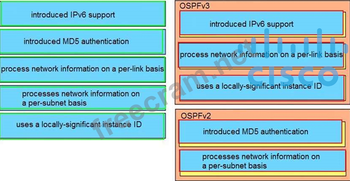 Compare different features between OSPFv2 and OSPFv3. Drag and drop the descriptions of OSPF from the left onto the correct OSPF versions on the right.
