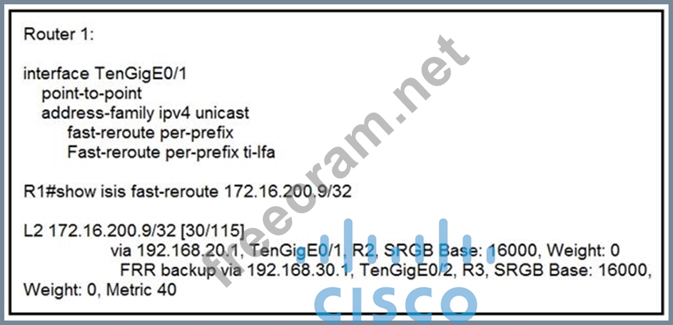 Router 1 is connected to router 2 on interface TenGigE0/1. Which interface provides the alternate path to 172.16.200.9/32 when the link between router 1 and router 2 goes down?