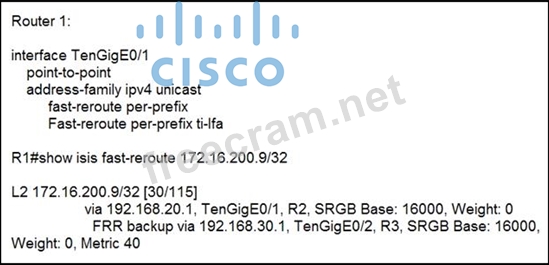 Router 1 is connected to router 2 on interface TenGigE0/1. Which interface provides the alternate path to 172.16.200.9/32 when the link between router 1 and router 2 goes down?