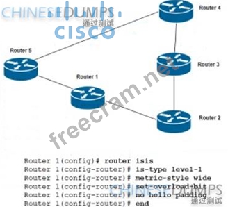 Refer to the exhibit. A network engineer commissioned Router 1, which connects lo Router 2 and Router 5 Router 1 participates in IS-IS routing with other routers, but it is not used for transit traffic. Traffic from Router 2 to Router 5 is expected to travel via Router 1 but the traffic is travelog via Router 3 and Router 4 Which action reserves this problem?