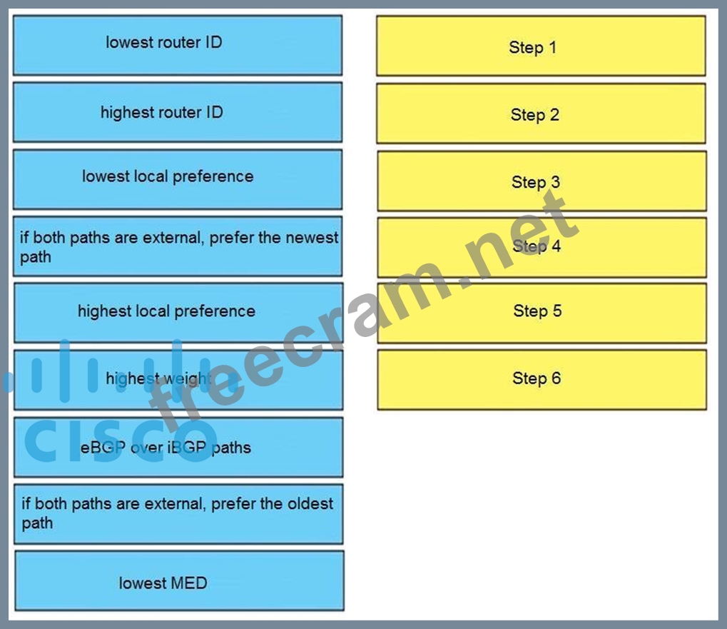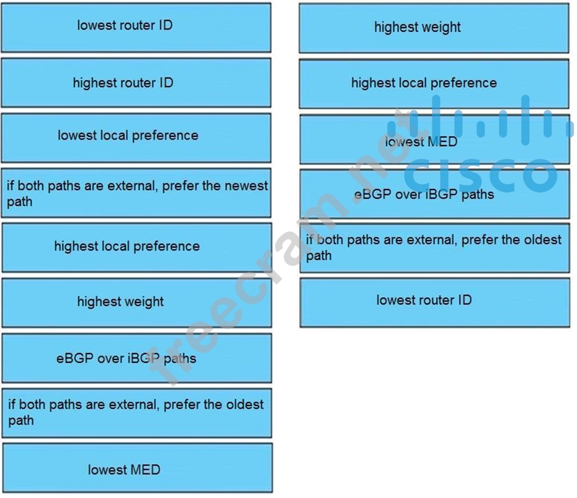 Drag and drop the attributes for the BGP route selection on the left into the correct order on the right. Not all options are used.