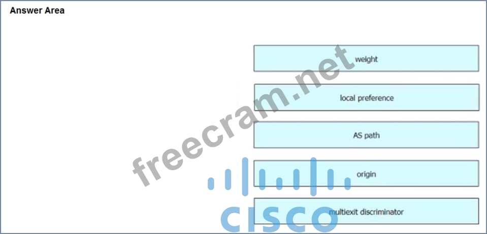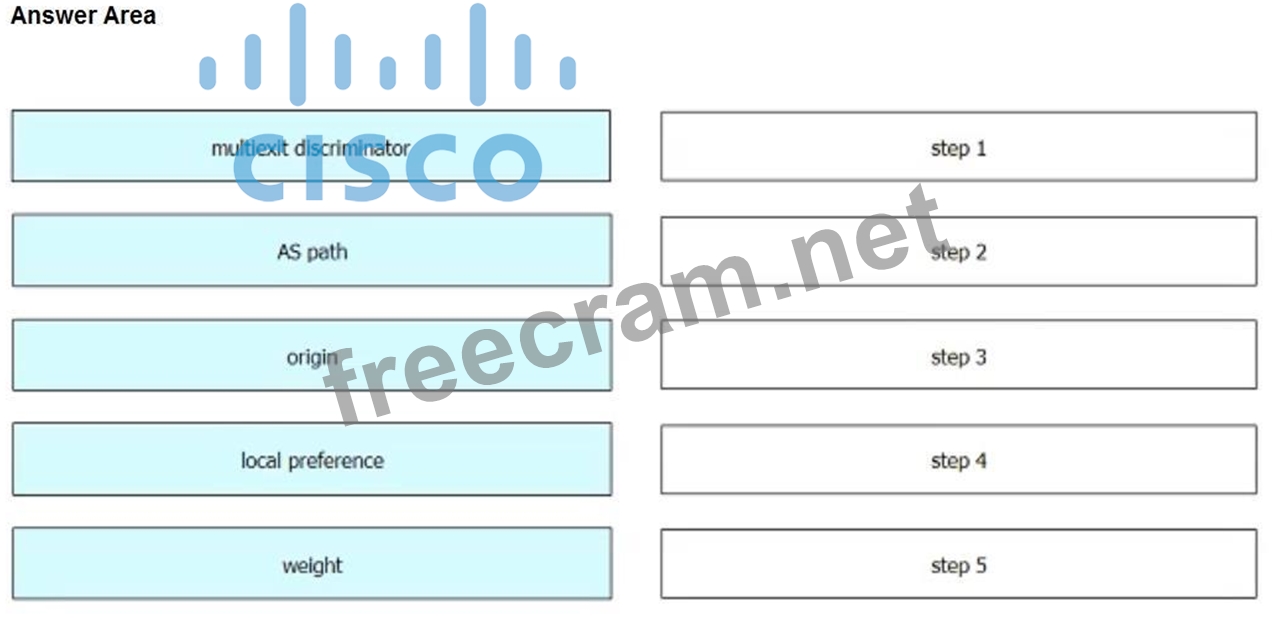 Drag and drop the BGP attributes from the left into the order of route selection preference on the right.