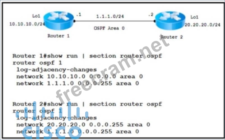 Refer to the exhibit. A network engineer at a large ISP with an employee ID 487694052 started to configure OSPF on two routers. The engineer notices that router 1 learned about network