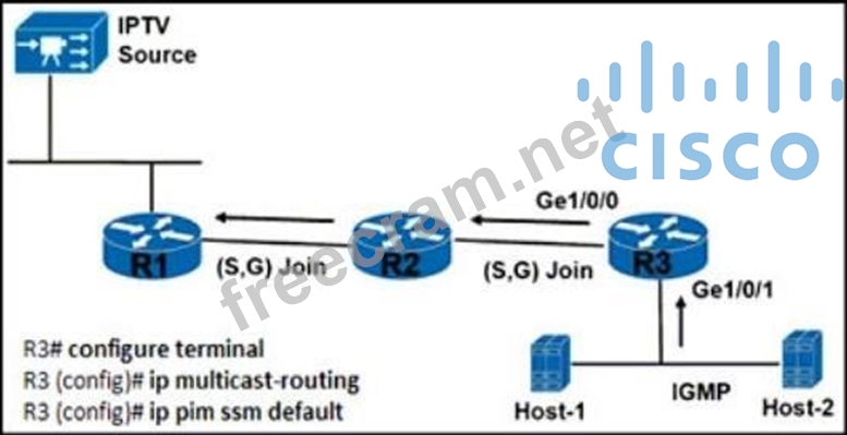 Refer to the exhibit. A network engineer is configuring router R3 to handle multicast streams, but Host-2 cannot send subscription messages to the IPTV source. Which configuration must the engineer apply to router R3 so it passes the IPTV stream to Host-2?