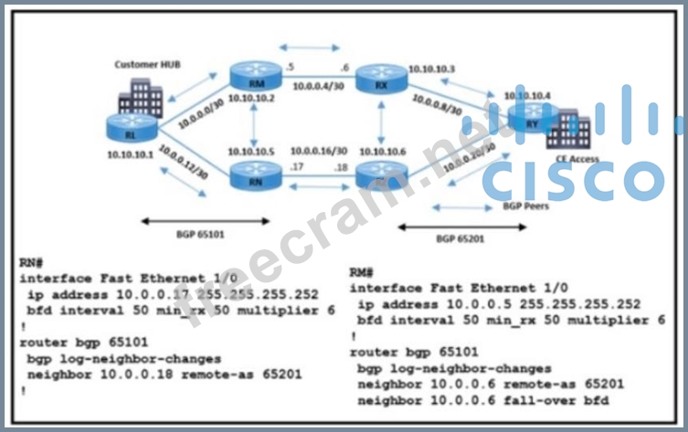 Refer to the exhibit. EBGP peering is up between BGP AS 65101 and BGP AS 65201. The service provider expects traffic convergence within 300ms between the two autonomous systems but the network operations team sees that route and traffic convergence is too slow. Which two actions improve the convergence time? (Choose two.)
