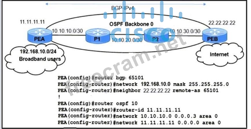 Refer to the exhibit. The service provider environment has these configurations: - The OSPF backbone area is configured to advertise loopback prefixes. - The PE routers run the BGP-IPv4 address family in a BGP-free core topology. - The broadband users IP subnet 192.168.10.0/24 is redistributed in BGP on PEA. The operations team noticed route disruptions when broadband subscriber 192.168.10.8 goes offline. Which configuration must an engineer apply to PEA to resolve this problem?