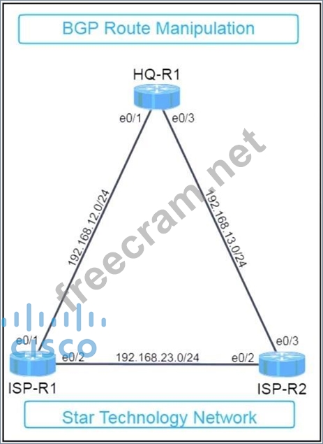 Based on network design, an autonomous system of Star Technology is 1, and AS of ISP is 2. A network Implementation Engineer has already initiated the configuration; trouble-shooting is required to find out and complete missing configurations. Moreover, configuration is to be established in a way that links between HQ-R1 and ISP-R1 can be used as the preferred path for reaching AS 2.