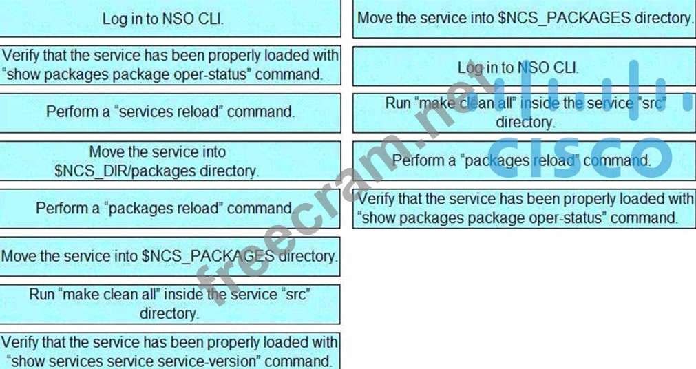 Drag and drop the steps from the left into the correct order on the right to deploy an already created service into NSO. Not all options are used.