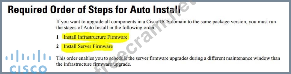 An engineer must upgrade all components in a Cisco UCS domain to the same package version, but the upgrade process fails to complete. Which set of Auto Install actions resolves the problem?