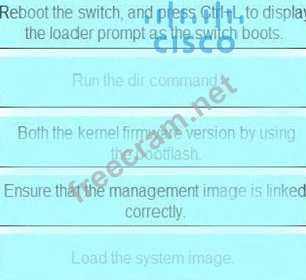 A firmware upgrade on a fabric interconnect fails. A bootflash contains a valid image. Drag and drop the recovery steps from the left onto the correct order on the right.