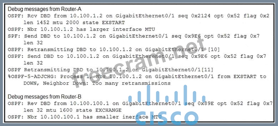 An OSPF adjacency between Router-A and Router-B cannot reach the FULL state. Which action resolves the issue?