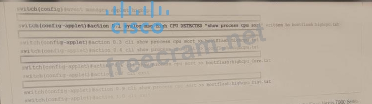 Refer to the exhibit. The EEM script is applied in the default VDC to collect the outputs during high CPU utilization on the Cisco Nexus 7000 Series Switch for all VDCs. Which configuration set must be added to the script to fix the issue?