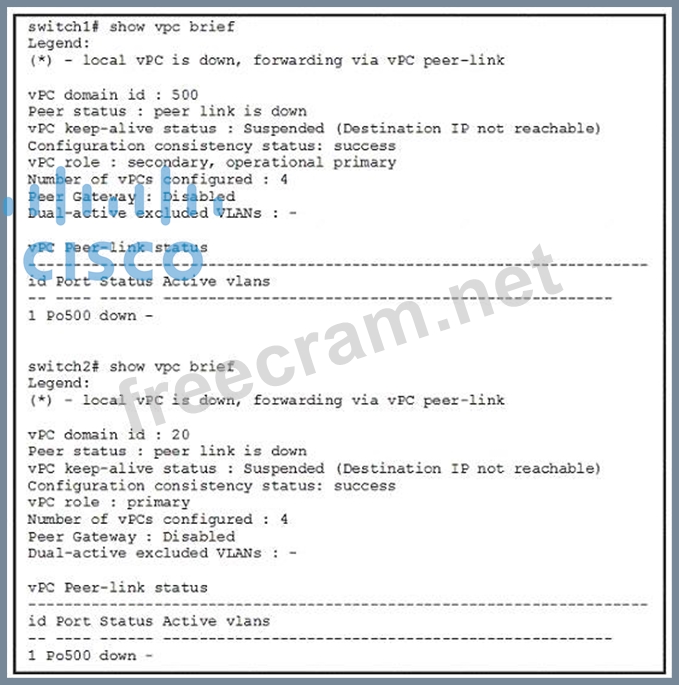 Explanation Both "vPC peer link" and "Peer keepalive link" are down. So, D is correct. SW1 is using vPC domain ID 500, which SW2 is using 20. They must match. So, E is correct.