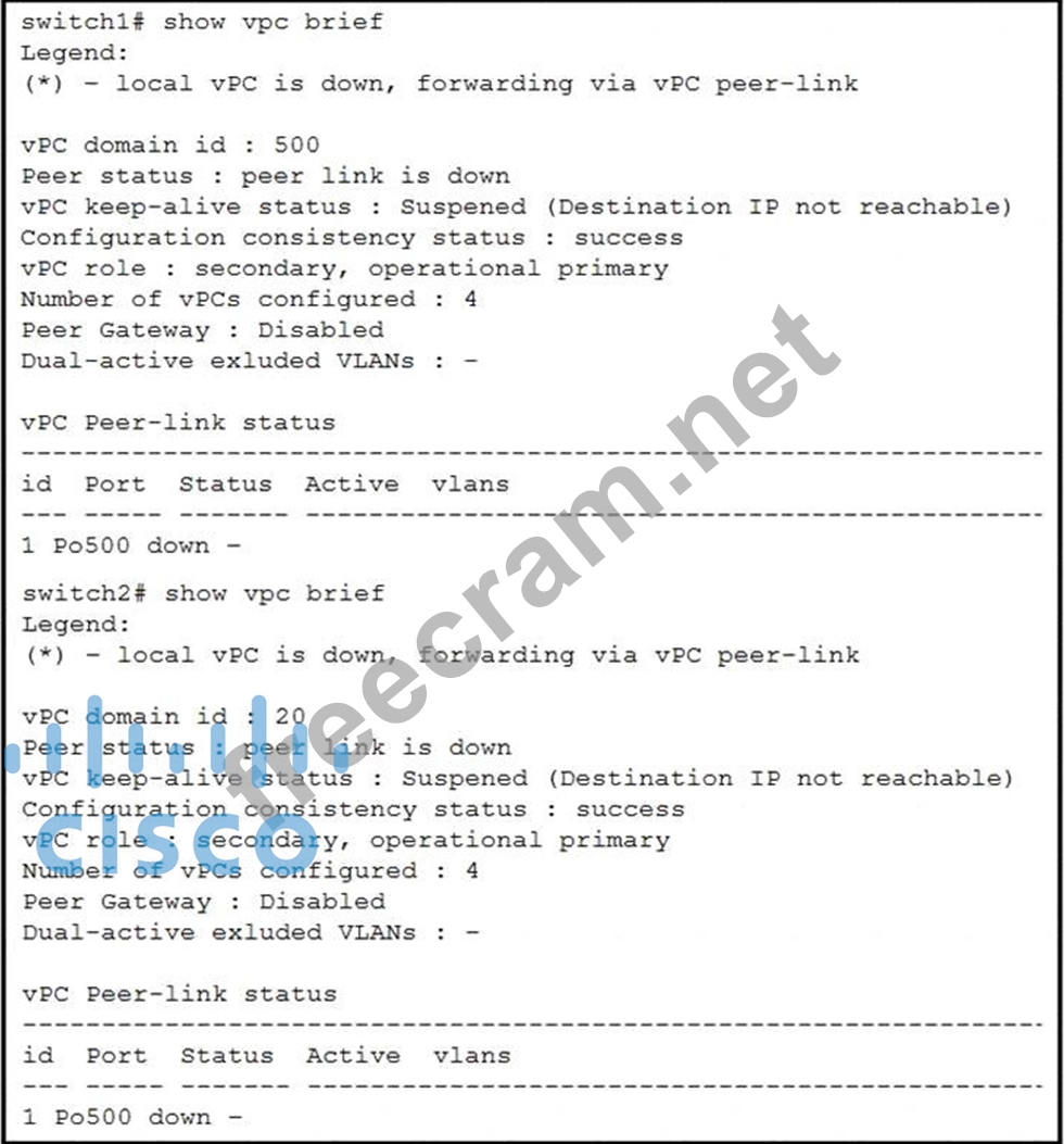 vPC between switch1 and switch2 is not working. Which two actions are needed to fix the problem? (Choose two.)
