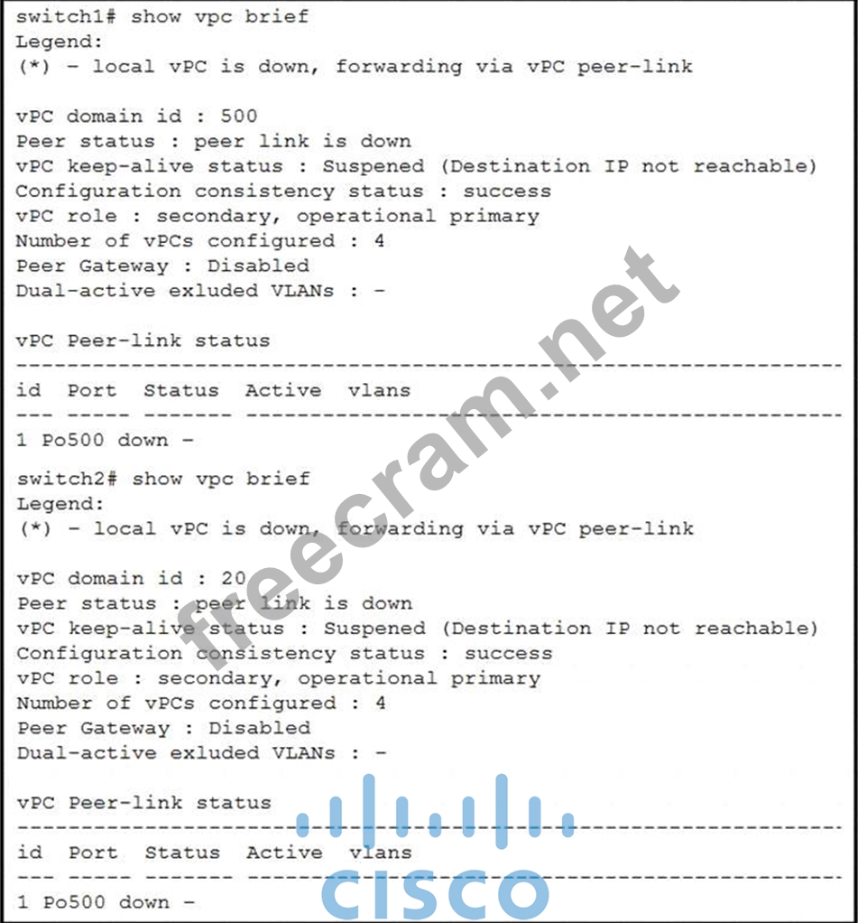 vPC between switch1 and switch2 is not working. Which two actions are needed to fix the problem? (Choose two.)