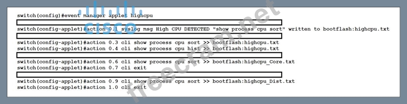 Refer to the exhibit. The EEM script is applied in the default VDC to collect the outputs during high CPU utilization on the Cisco Nexus 7000 Series Switch for all VDCs. Which configuration set must be added to the script to fix the issue?