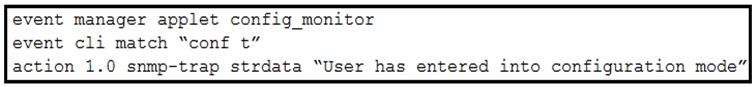 The EEM script fails to send an SNMP trap when a user attempts to enter configuration mode. Which configuration is missing from the script?