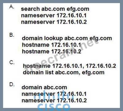 The device name is app with an IP address of 10.10.10.1. The primary server IP address is 172.16.10.1 and the secondary server IP address is 172.16.10.2. When the abc.com resolution fails, it should attempt to use efg.com. Which settings must be added to resolv.conf file to resolve the issue?