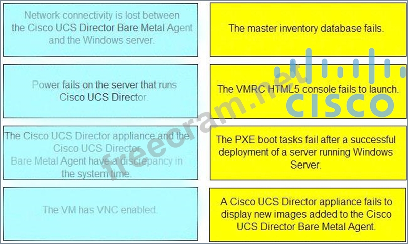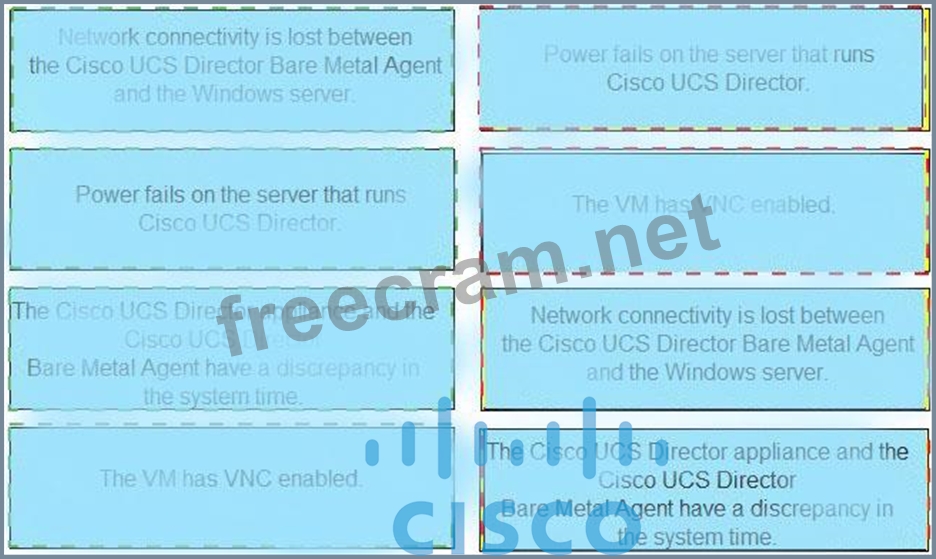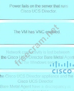 An engineer is troubleshooting issues in Cisco UCS Director. Drag and drop the possible causes from the left onto the correct issues on the right.
