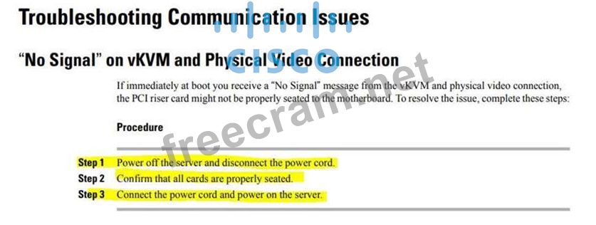 During a boot process of a Cisco UCS C-Series Rack Server, an engineer receives a "No Signal" message from the vKVM and physical connection. Which set of steps resolves the issue?