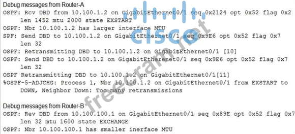 Refer to the exhibit. An OSPF adjacency between Router-A and Router-B cannot reach the FULL state. Which action resolves the issue?