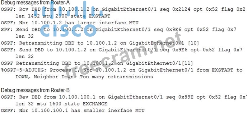 An OSPF adjacency between Router-A and Router-B cannot reach the FULL state. Which action resolves the issue?