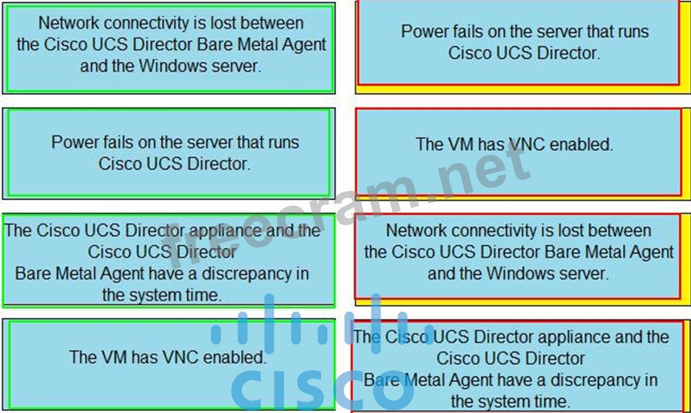 An engineer is troubleshooting issues in Cisco UCS Director. Drag and drop the possible causes from the left onto the correct issues on the right.