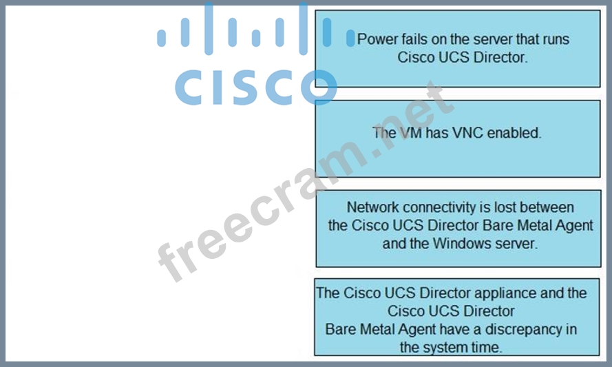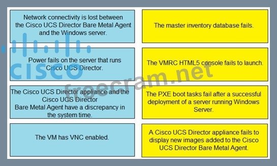 An engineer is troubleshooting issues in Cisco UCS Director. Drag and drop the possible causes from the left onto the correct issues on the right.