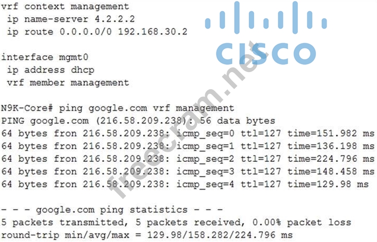 Refer to the exhibit. A network engineer has connected the Nexus switch management port to the Internet using DHCP to allow the Guest shell running on the switch to download Python packages. The engineer can ping google.com successfully from the Nexus switch, but the Guest shell failed to download any Python packages. Which action resolves the problem?