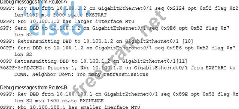 Refer to the exhibit. An OSPF adjacency between Router-A and Router-B cannot reach the FULL state. Which action resolves the issue?
