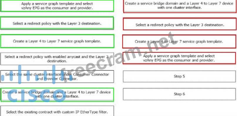 Refer to the exhibit. A Cisco ACI fabric is newly deployed, and the security team requires more visibility of all inter-EPG traffic flows. All traffic in a VRF must be forwarded to an existing firewall pair. During fallover, the standby firewall must continue to use the same IP and MAC as the primary firewall. Drag and drop the steps from the left Into the Implementation order on the right to configure the service graph that meets the requirements. (Not all steps are used.)